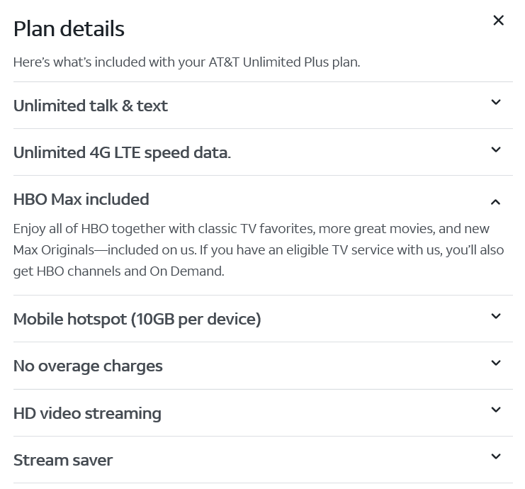 Other AT&T plans do not get access to free HBO/HBO Max including all prepaid plans and business plans, plus data-only plans such as the Mobley, connected car, RV plans and tablet plans.