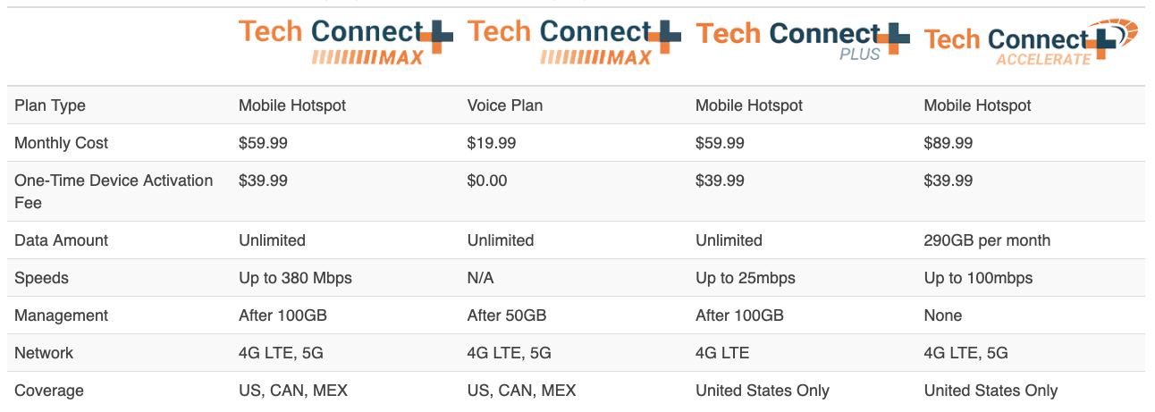 Tech Connect+ MAX actually has multiple options - a data plan with or without an included mobile hotspot device, and a smartphone plan. The AT&T and Verizon options only offer data plans.