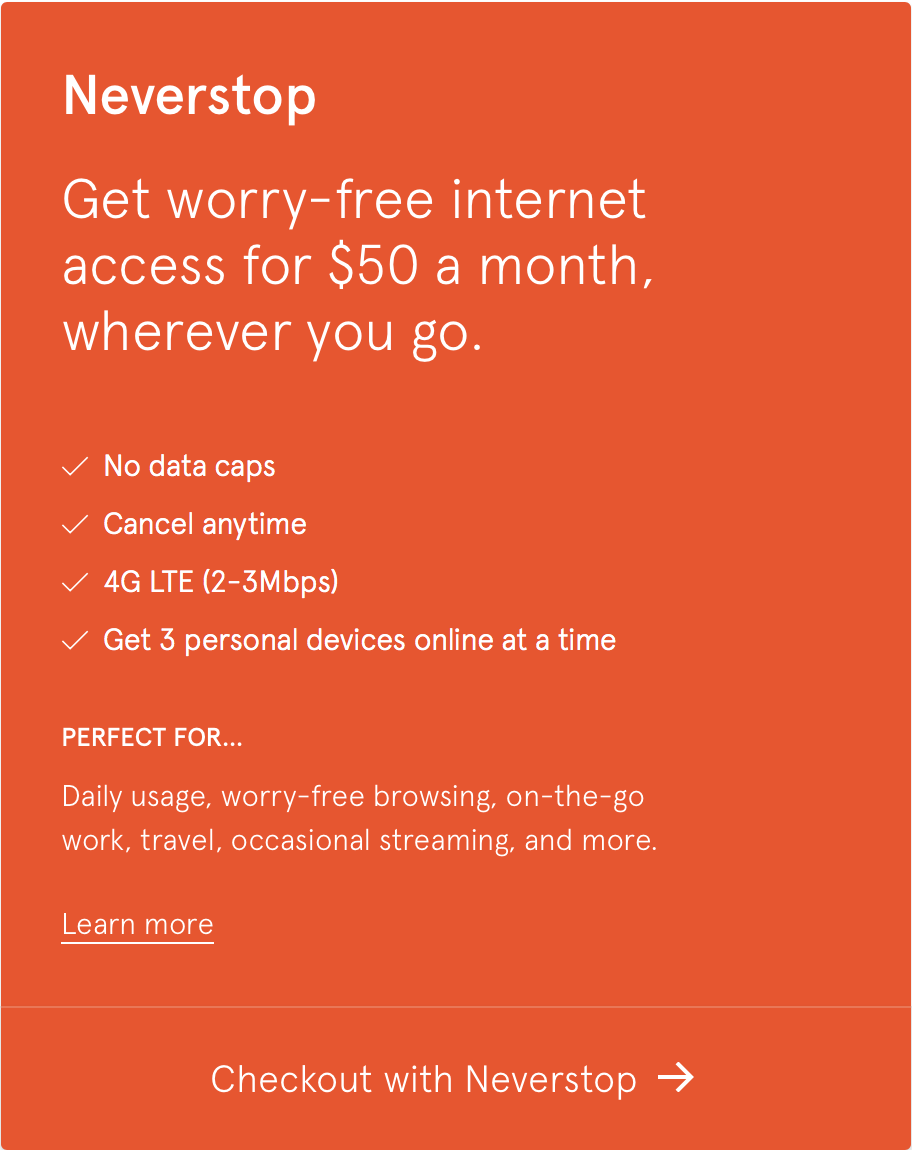 Neverstop aims to change that by offering truly unlimited data for an ongoing monthly subscription of $50/mo. They also have discounts for prepaying in bulk ($130 for 3 months - save $20, and $500 for 12 months - save $100)