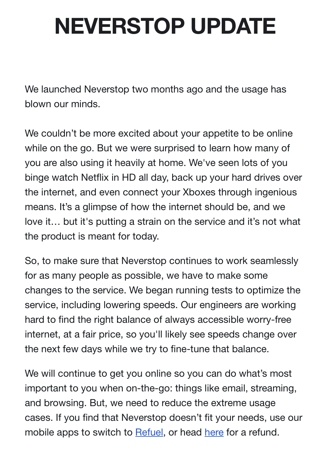 But we were surprised to learn how many of you are also using it heavily at home. We've seen lots of you binge watch Netflix in HD all day, back up your hard drives over the internet, and even connect your Xboxes through ingenious means. It’s a glimpse of how the internet should be, and we love it… but it's putting a strain on the service and it’s not what the product is meant for today.