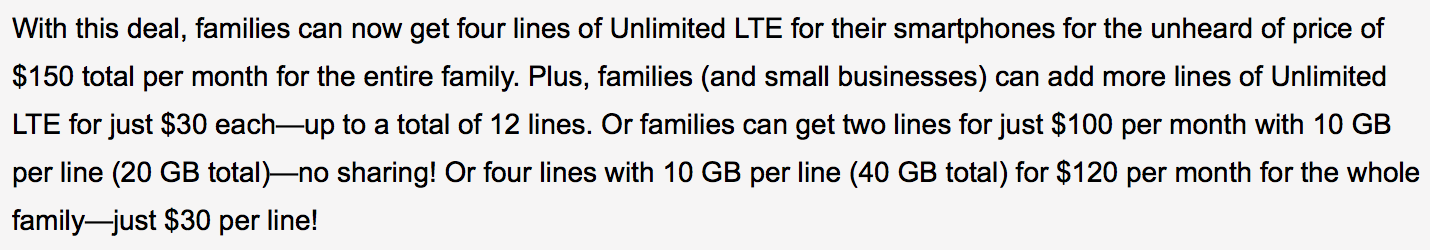 - For $150/month - you can get 3 or 4 unlimited smartphone lines, each with unlimited ondevice data and 14GB of tetherable data to share with other devices. After 25GB of usage however, the lines are subject to network management (meaning speeds may be reduced on congested towers). This brings the normally $95/line price down to as little as $37.50/line.