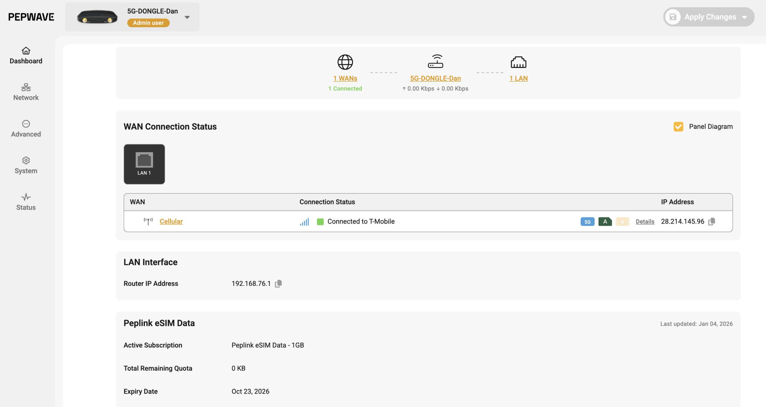 When connected directly to a computer, the Pepwave 5G Dongle offers a basic local web interface for viewing cellular status, signal metrics, and connection details. When paired with a compatible Peplink router, the dongle appears as a standard WAN interface within the router’s dashboard and can also be monitored and managed through Peplink’s InControl2 cloud management system, alongside other WAN connections.
