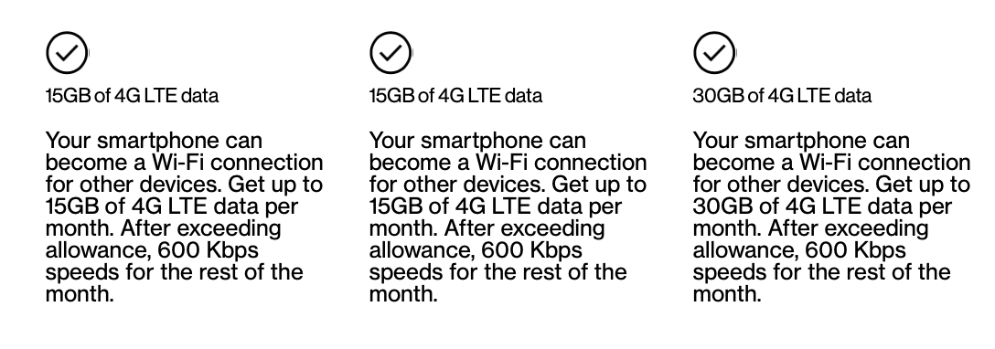 The outgoing Get More comes with a hard 30 GB cap on high speed mobile hotspot use, and the Do More and Play More Plan have a 15 GB limit.