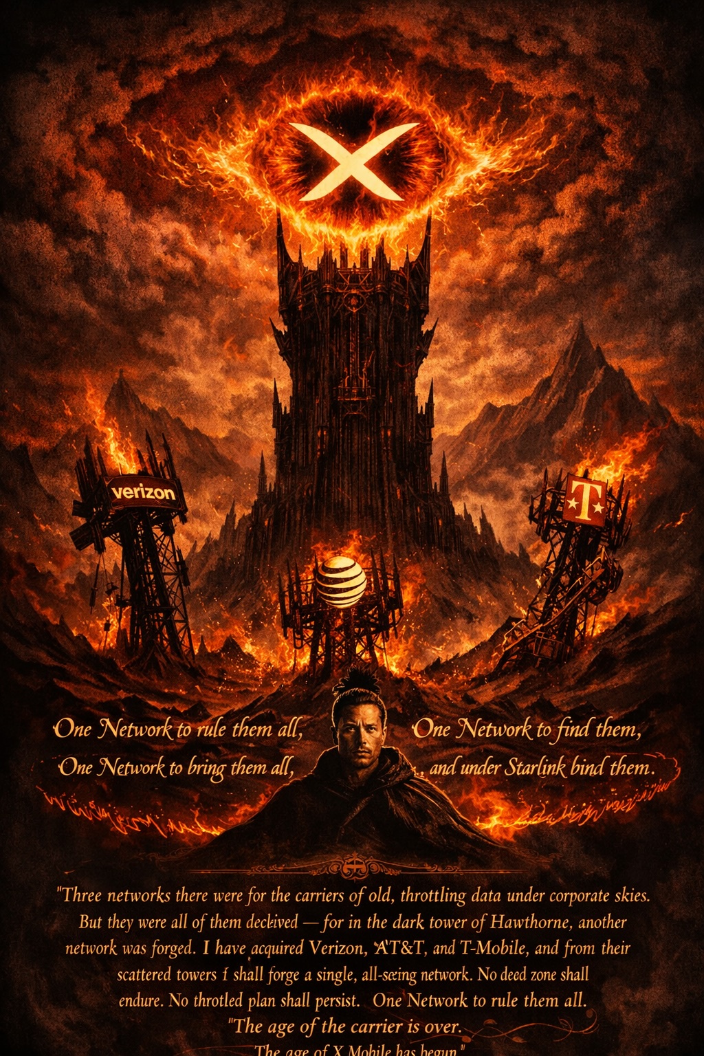 I have acquired Verizon, AT&T, and T-Mobile, and from their scattered towers I shall forge a single, all-seeing network. No dead zone shall endure. No throttled plan shall persist. One Network to rule them all. The age of the carrier is over. The age of X Mobile has begun."