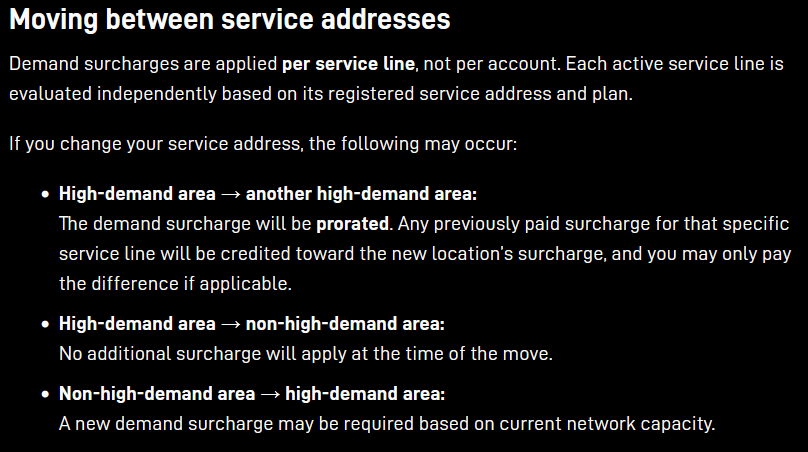 - Moving a Residential service address into, or between, high-demand areas can also trigger a demand surcharge.