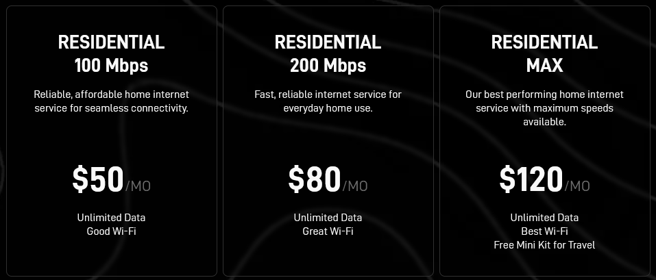 The Max plan now comes with some nice perks as standard, all for the same base price of $120. The 200 and 100 Mbps plans remain the same as the previous Lite and Lite 100 plans, except the Residential 100 Mbps plan is $10 more at $50/month.