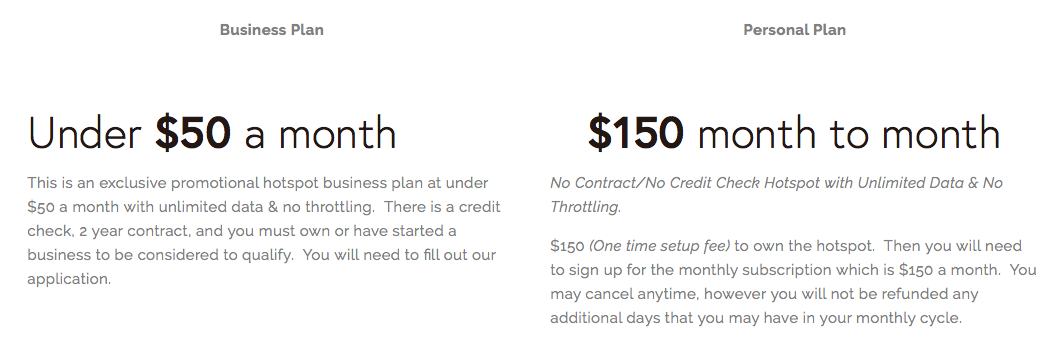 You purchase a hotspot device from them for $150 that you own, and then set up a re-occuring PayPal payment with Unlimitedville for access to one of their unlimited T-Mobile lines. They claim the plan is not subject to throttling or network management - meaning you should receive the full speeds available on towers connected to.